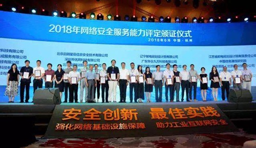 ▲工信部网络安全试点示范经验交流会暨第八届电信和互联网行业网络安全年会上,通过网络安全服务能力评定的企业上台接受颁牌