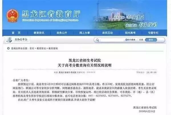 按照预定计划,我省考生6月24日零时可以通过网络查询2018年高考分数。昨天22时,发现我院龙招港网络阻塞。经公安网监部门、联通公司等专家初步分析判断,网络被恶意攻击。通俗地讲,就是来我家访问的路被人故意封堵。考生无法登录网站,有关技术人员连夜查找原因,积极研究解决方案,尽快恢复运转。现已经启动应急预案,可在我院、市(地)、县(区)招考机构及考生所在学校进行现场分数查询,也可电话查询分数:0451—82376052、82376055、82376279。