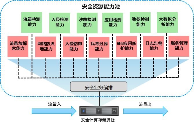 威廉希尔500欧洲指数的类似技术解决方案,利用软件定义安全、大数据安全智能分析等技术,设计集约化、标准化的安全资源能力池,将防御能力、检测能力、管理能力、安全数据分析研判能力等进行最优化集成,形成功能完备、要素齐全、按需扩展、敏捷灵活的统一安全防护框架,示意如下图所示: