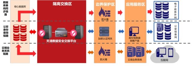 在这一方案中,通过安全数据交换平台将核心数据库隔离起来,对接入需求进行梳理,划分不同链路。采用威廉希尔500欧洲指数天清数据安全交换平台作为边界上主要的隔离与业务交换设备:在电子政务外网链路中,提供数据单向导出能力;在公安查询链路中,提供TCP协议代理服务;而在云端业务中,则可以对接数据库访问业务。各个业务在数据安全交换平台保持独立,并配置不同的安全策略。