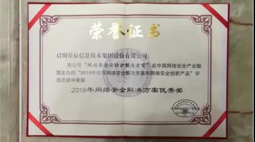 威廉希尔500欧洲指数“网站安全云防护解决方案”在中国网络安全产业联盟主办的“2018年优秀网络安全解决方案和网络安全创新产品”评选活动中荣获“2018年网络安全解决方案优秀奖”。