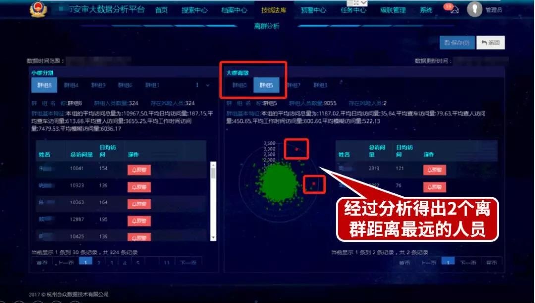 合众LAS系统无需对用户应用系统业务进行任何直接操作的前提下,自动选取一定时间段内的日志数据,对人员的作息时间、工作地点、行为特性(操作频度及工作热区时间段)、个人特征(年龄及所属机构)等多个维度进行离群分析,从而挖掘出存在异常行为的人员,即用户或账号,如下图所示: