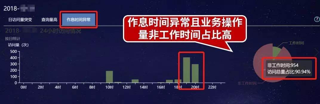 从结果展示可以看出,该用户或账号对业务系统的操作行为,主要集中在上午10点左右、晚上7点至8点这两个时间段内,且非工作时间访问占比较高。