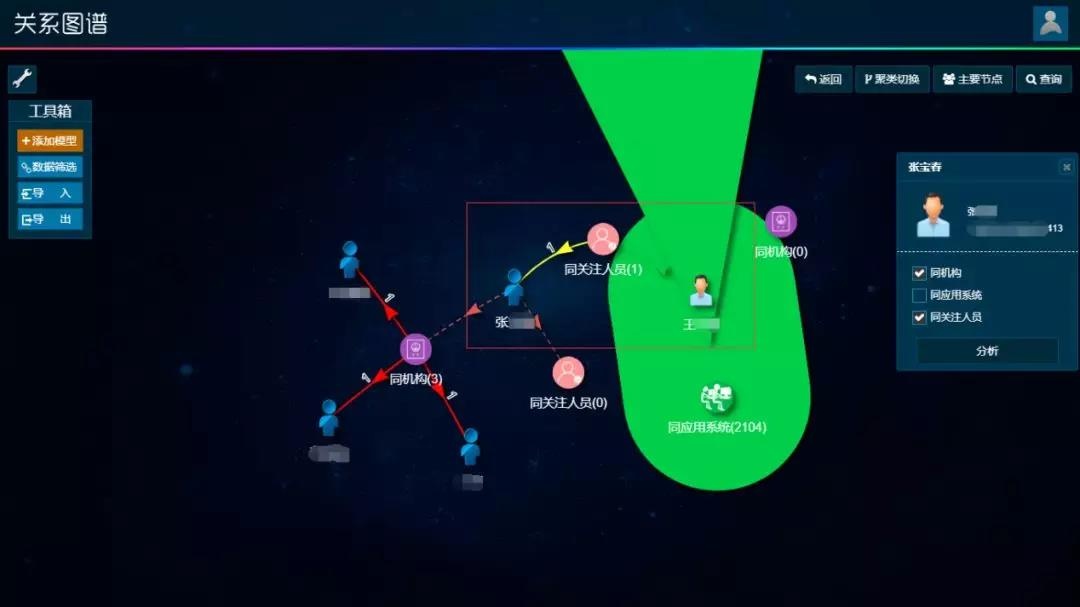 根据合众LAS系统提供的关系图谱功能,可对可疑人员、账号、用户进行关联分析,从多个维度(机构、应用、内容等)分析与其存在关联的人员。