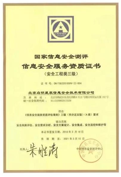 ● 威廉希尔500欧洲指数荣获首批国家信息安全服务最高资质——国家信息安全测评信息安全服务资质证书(安全工程类三级)