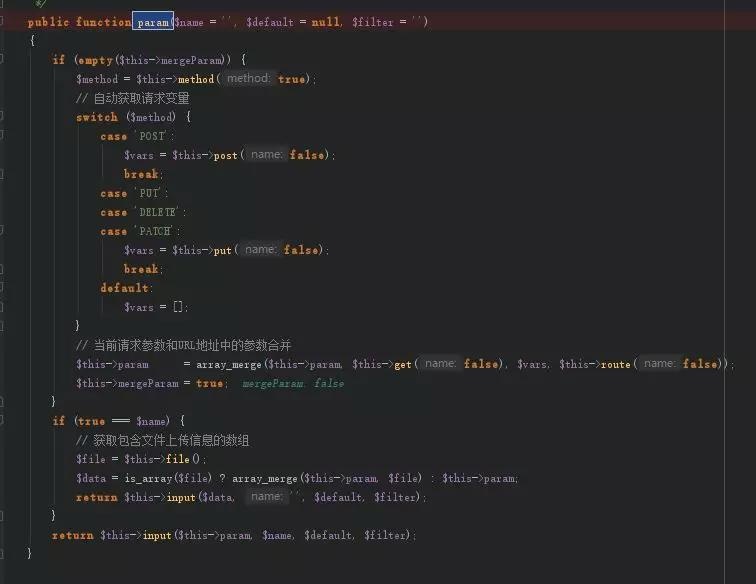 在5.0.23 Request类中有个param成员函数用于获取当前请求的参数,也有个method函数: