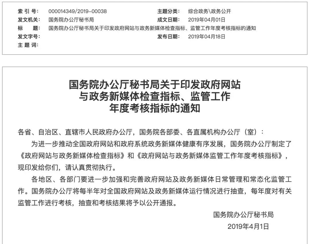单项否决 | 国务院办公厅发布政府网站与政务新媒体检查指标及监管工作年度考核指标