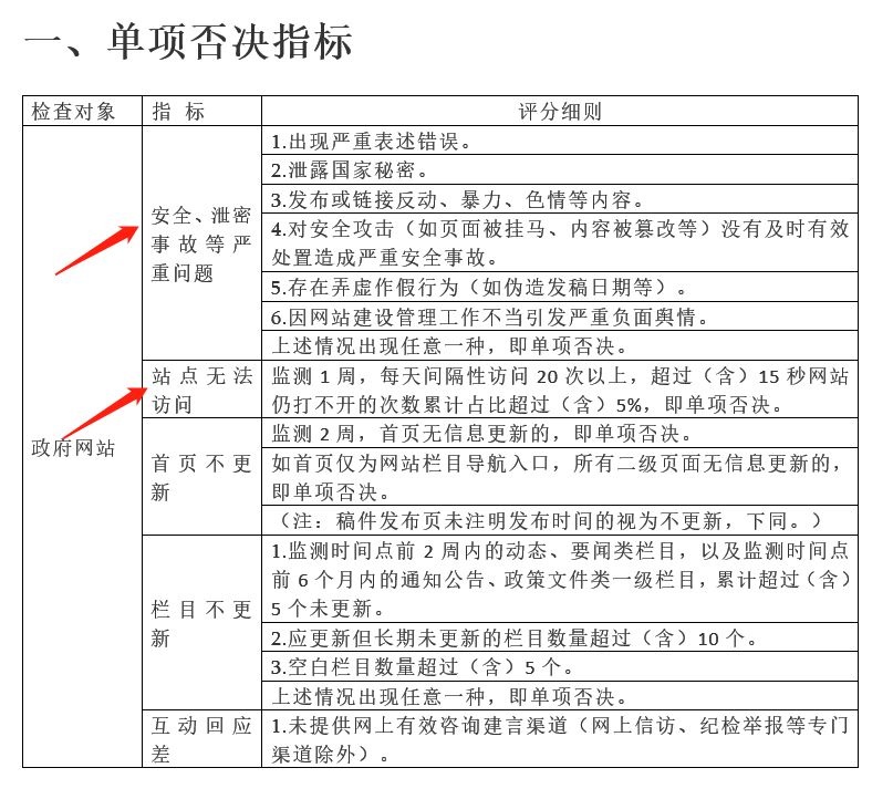 对政府网站和政务新媒体检查时,出现单项否决指标中的任意一种情形,即判定为不合格!