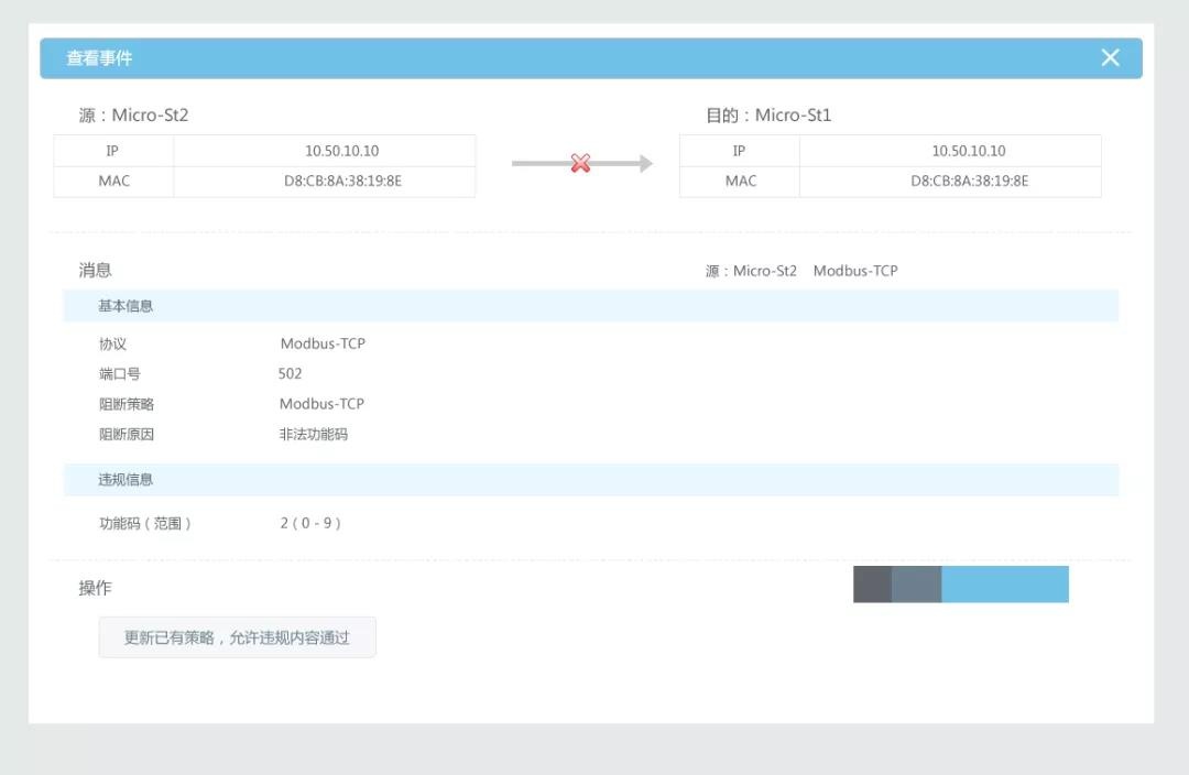 解决之道:针对系统可用性为工业系统最高优先级的要求,威廉希尔500欧洲指数工业防火墙前期所有业务的学习和规则编排都可以采用旁路。这样可以极大降低用户的进入门槛,安全规则在旁路下可以实现和串行一样的验证效果,梳理完成,无风险后,再串入生产网络,将风险降到零!针对业务的学习、规则的编排、事件响应,整个逻辑链条的验证都实现了旁路模式,该模式是业内首创。
