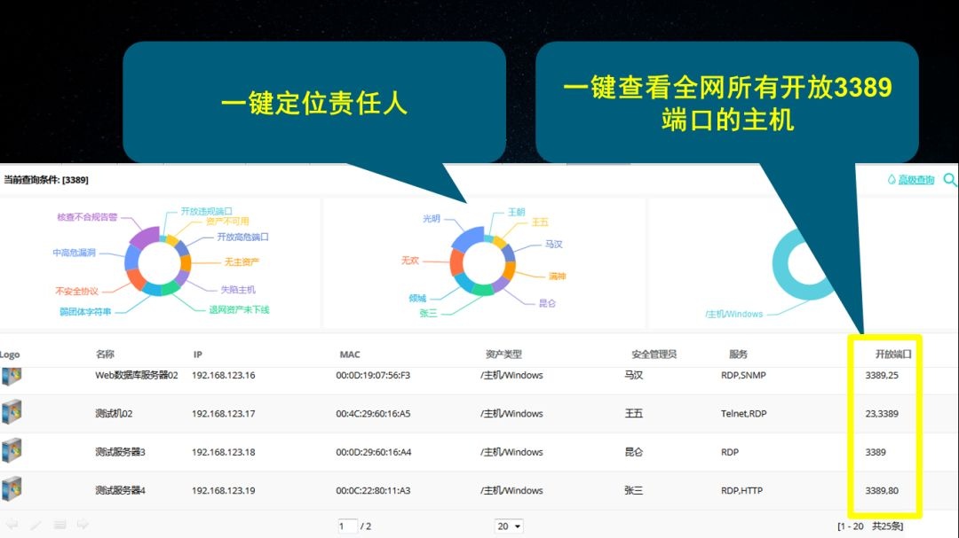 从所有IT资产中,一键助力客户发现全网所有开启3389端口的主机,一键筛查可能影响的IP数量,一键定位设备责任人,方便客户快速排查风险隐患。