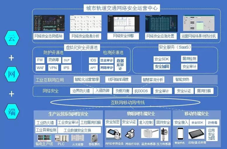 同时,要符合《智慧城市轨道交通信息技术架构及网络安全规范》“系统自保、平台统保、边界防护、等保达标、安全确保”的策略,覆盖生产运营系统控制设备、物联网设备、移动终端、云平台,搭建覆盖云、网、端的网络安全防护体系,形成如下图所示的总体架构: