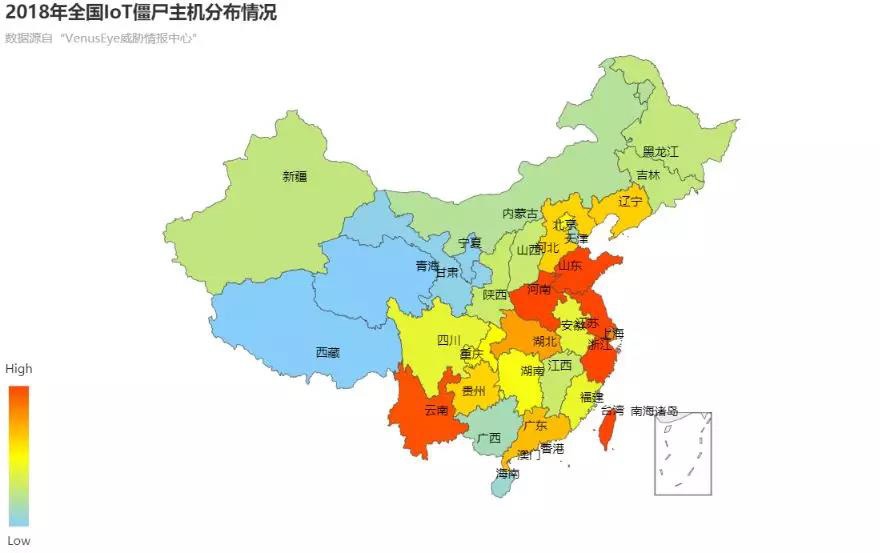 我国境内IoT僵尸主机分布最多的五个地区分别为山东、河南、江苏、浙江和云南。