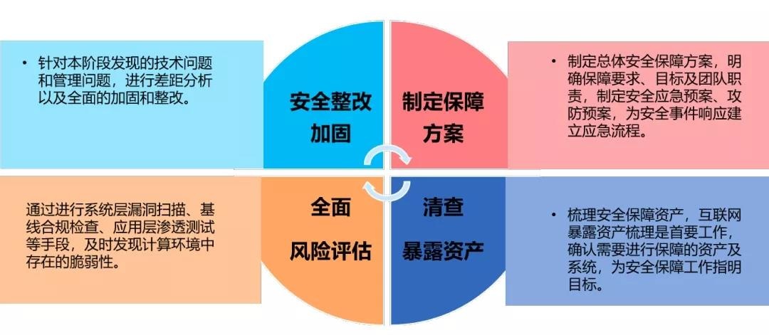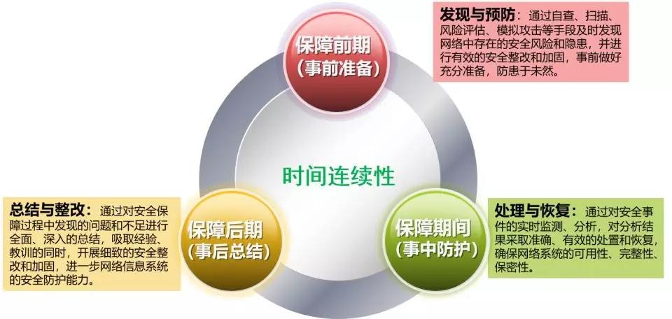 事前通过风险评估、模拟演练等手段,及时发现潜在风险和隐患,进行安全整改和加固;事中通过实时监测,发现安全事件,进行分析和快速处置;事后分析问题,找出症结,并进行针对性的安全整改和加固。