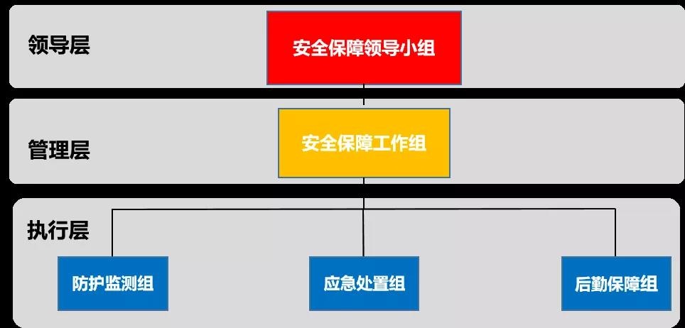 为了保障重保任务的顺利完成,建议活动开展单位组织成立领导层面的安全保障领导小组,管理层面的安全保障工作组,以及执行层面的防护监测组、应急处置组和后勤保障组3个小组,组织架构如下图: