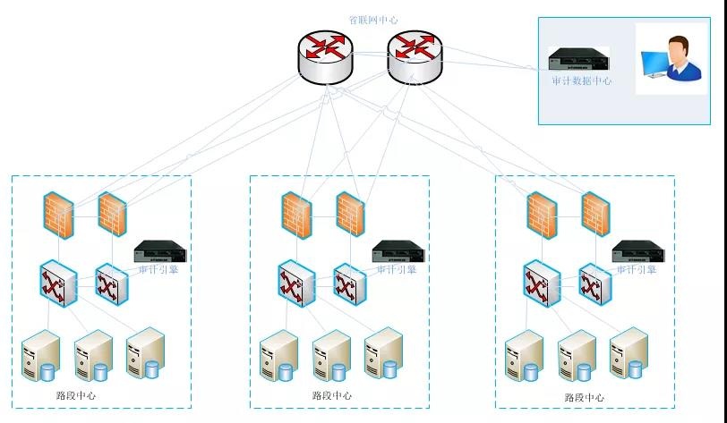 交通联网收费系统包括省级清分中心与区域/路段中心,因此我们采用分布式部署方式,在区域路段部署审计一体机或引擎,在省中心部署数据中心进行统一管控和分析。