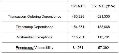 通过对OYENTE的源码进行了修改以嵌入增强算法,及对OYENTE能识别的四种合约漏洞进行了实验,结论见下表。针对交易顺序依赖、时间依赖和重入类型的漏洞,增强OYENTE能检测更多的漏洞。针对未处理异常漏洞,增强OYENTE未能提升检测能力;对OYENTE进行源码分析发现,这是因为这类漏洞是直接用合约字节码扫描来检测的,与控制流分析无关。