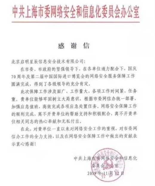 威廉希尔500欧洲指数安全服务团队在11月2日提前进驻某局科信部门安保现场,对相关网络和系统进行全面安全检查,并做好充分备份工作,对我司所有网络安全设备产生的安全日志进行全面分析。进博会召开前夕,安全服务团队连续奋战多个夜晚,全力保障安保相关业务系统的网络安全稳定运行,成功保障进博会顺利召开。