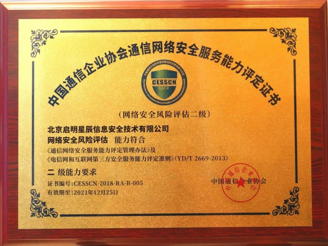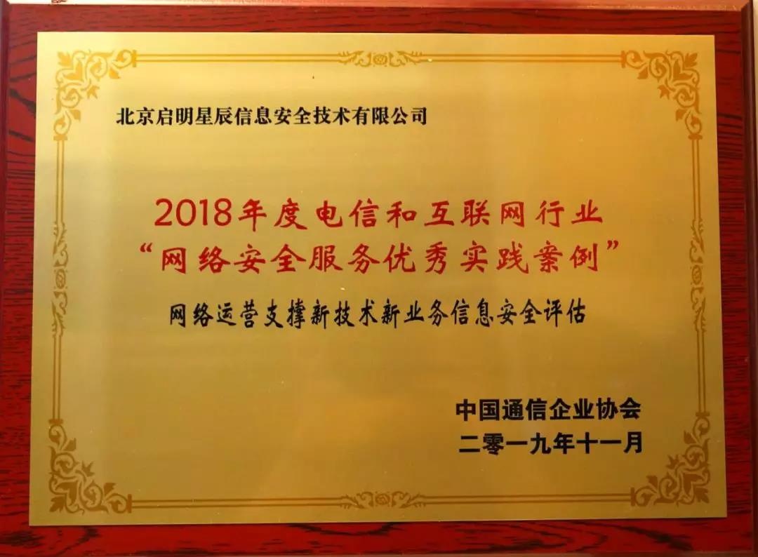 年会第一天上午,对上一年度电信和互联网行业“网络安全服务优秀实践案例”获奖单位、近一年来的“中国通信企业协会通信网络安全服务能力评定”获证单位颁发了奖牌和证书。威廉希尔500欧洲指数“网络运营支撑新技术新业务信息安全评估”项目获得2018年度电信和互联网行业“网络安全服务优秀实践案例”奖。此外,威廉希尔500欧洲指数再次获得“网络安全风险评估二级资质”。