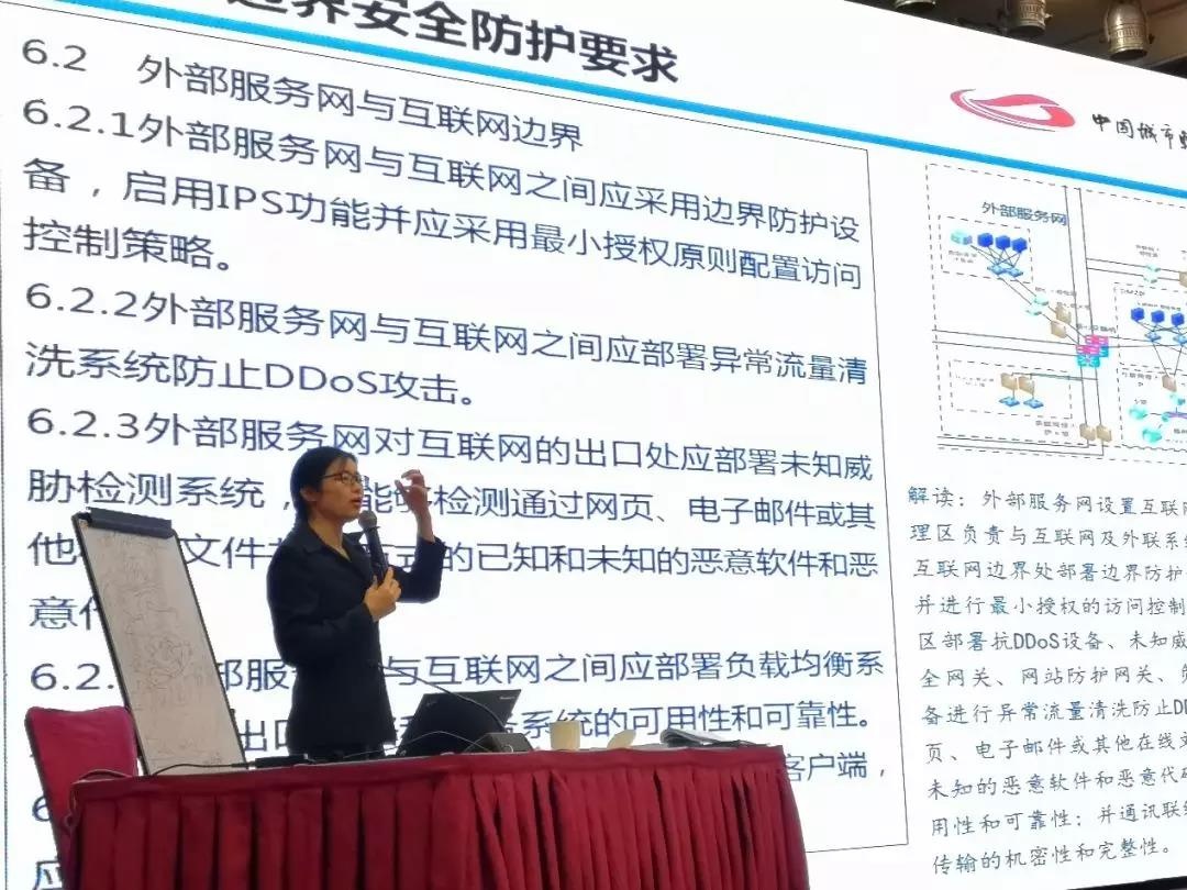 《规范》的第3部分《网络安全》部分由10章59节2.2万字组成,规定了网络安全体系架构、边界、网络、云计算环境、主要业务系统安全以及安全管理的要求。启明星星辰资深安全专家、助理总裁李转琴就网络安全部分内容进行了宣贯和讲解。她结合“系统自保、平台统保、边界强保、等保达标、安全确保“二十字指导思想,针对《规范》要求中所提及的横向分区、纵向隔离的网络安全技术架构进行了分析,就如何为城轨业务系统提供全方位支撑,对信息系统的各个关键技术之规定给予澄清,并分析了《规范》的全面性、合理性、技术先进性及轨道交通领域的适用性。