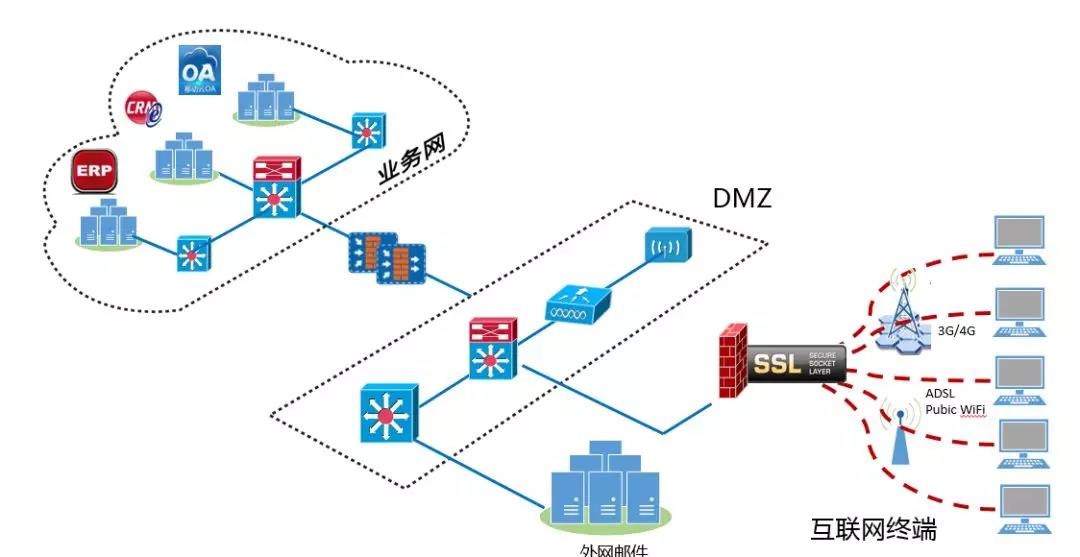 虚拟化VPN系统推荐以旁路单臂模式部署在DMZ区域或者核心交换机一侧,确保VPN与内网服务器之间网络可达。示意拓扑见下图: