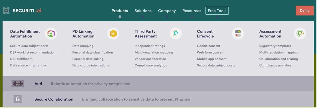 Securiti.ai是今年的创新沙盒获胜者,这家初创公司成立于2018年,与BigID类似也是提供合规类的数据安全解决方案的,主要面向GDPR、CCPA(美国于2018年6月通过的加利福尼亚州消费者隐私保护法案)和LGPD(巴西于2018年通过的通用数据保护法)为客户提供自动化的数据隐私合规产品和解决方案。Securiti.ai的主要产品有DSR Fulfillment Automa tion、PD Linking Automation、Assessment Automation、Third Party Risk Assessment 和 Consent Lifecycle,并通过一款叫Auti的机器人实现对隐私合规的机器人自动化(Robotic Automation)。