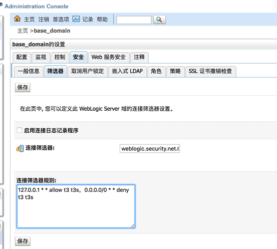 1)进入WebLogic控制台,在base_domain的配置页面中,进入“安全”选项卡页面,点击“筛选器”,进入连接筛选器配置。