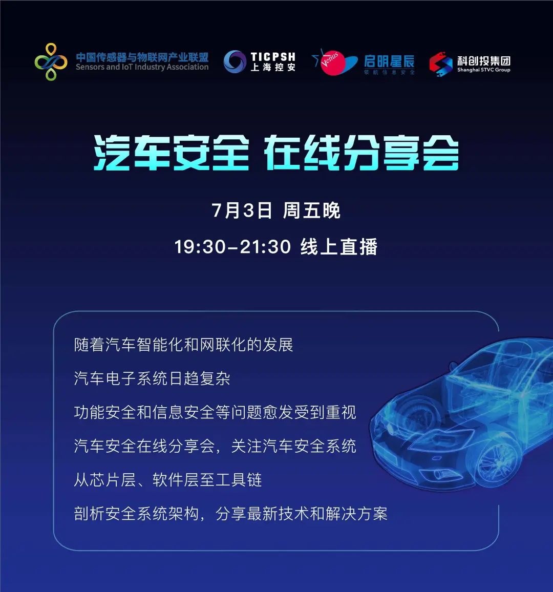 本次分享会由威廉希尔500欧洲指数集团、中国传感器与物联网产业联盟、上海控安、科创投集团联合主办,邀请了科研机构、零部件厂商、车厂等行业的各位专家在线分享汽车安全,从芯片层、软件层到工具链,剖析整个汽车安全系统架构,并围绕汽车全产业链的安全保障、信息安全防护、大交通及新基建发展趋势及场景展开讨论。