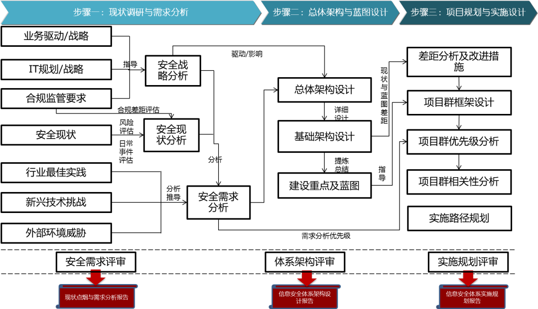 威廉希尔500欧洲指数为某汽车集团提供的网络安全规划服务主要内容包括:现状调研与需求分析、总体架构与蓝图设计、项目计划与实施设计,如下图所示: