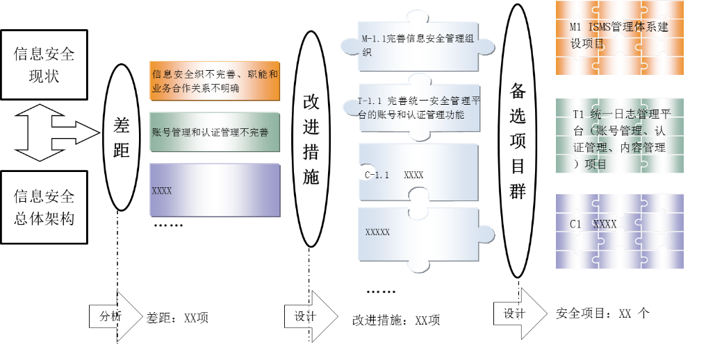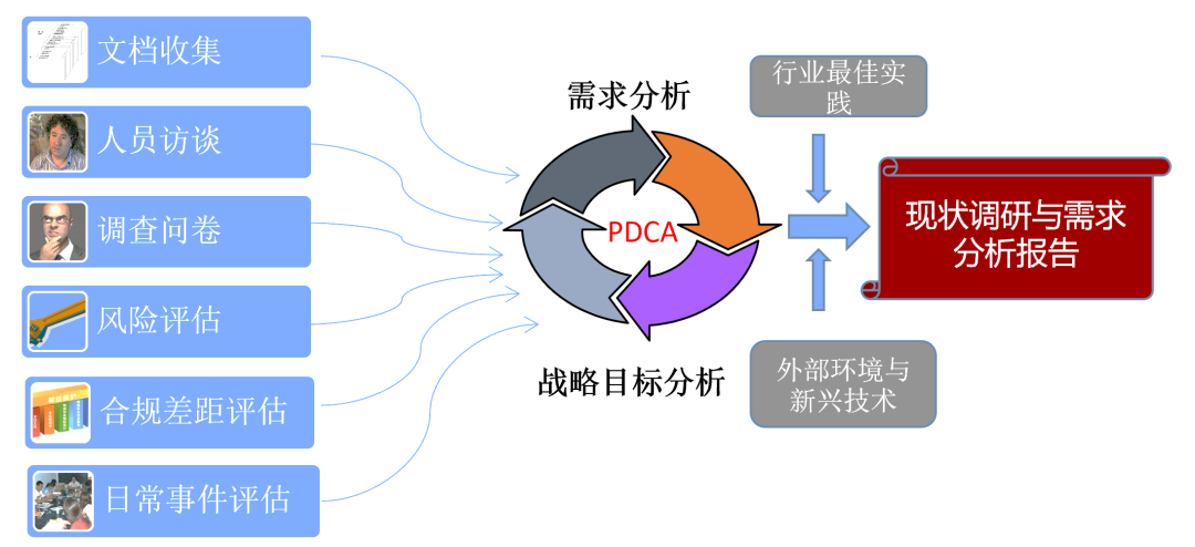以风险评估、合规差距评估、组织自身需求等手段为基础,开展针对性的网络安全现状分析,帮助了解自身网络安全现状,识别网络安全风险,找出客户网络安全现状与安全战略目标之间的差距。