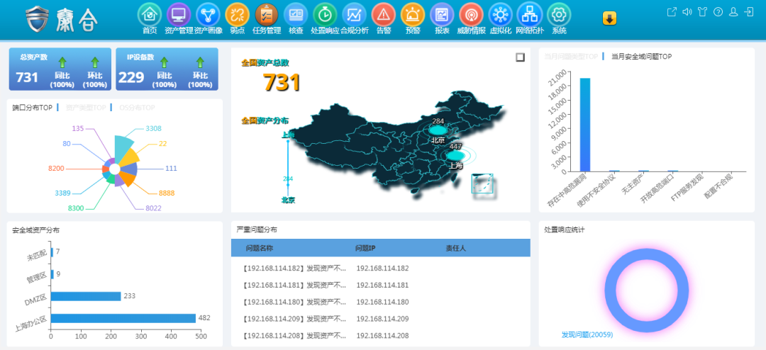 资产异常问题需要从管理状态、端口开放状态、脆弱性分布状态等层面监视资产的变化,识别发现典型的资产暴露面的安全问题,及时通知通告责任人,需要对问题的整改落实进行全方位的监控。