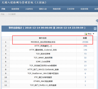 在集成商仿真环境中工控异常检测系统有效检测出网络中的基于Modbus协议的模拟攻击行为,实现告警。
