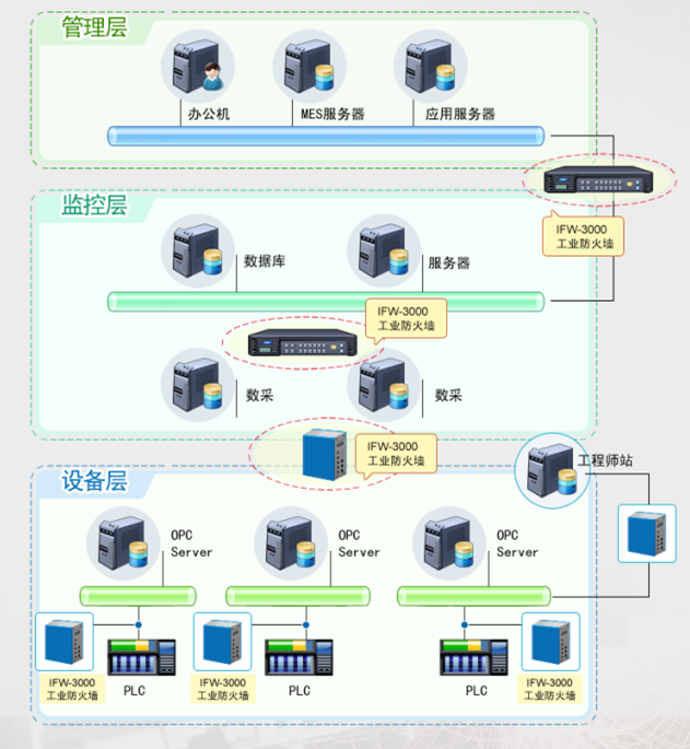 通过部署工业防火墙可以有效划分安全区域,提供从边界、区域到终端的完整防护;可有效降低网络被入侵;有效防止安全威胁迁移扩散,可有效解决工业系统间因缺少隔离引起的安全问题,如因配置错误,硬件故障、病毒等引发的安全威胁。