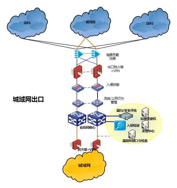 校园网互联网出口安全需要解决出口边界访问控制、入侵检测与防御、单链路故障、提升多链路带宽利用率、师生上网行为管理。