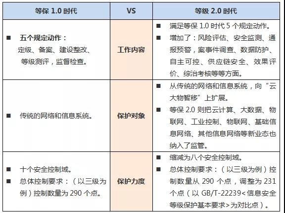 等级保护2.0较1.0相比,主要的变化体现在等级保护的工作内容扩展、保护对象的扩展、保护力度的提升这几个方面。