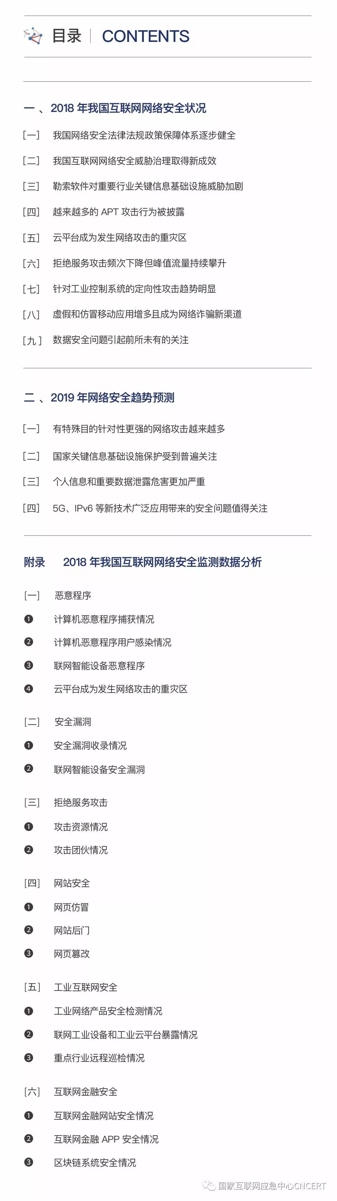 CNCERT依托我国宏观安全监测数据,结合网络安全威胁治理实践成果,在本报告中重点对2018年我国互联网网络安全状况进行了分析和总结,并对2019年的网络安全趋势进行预测。
