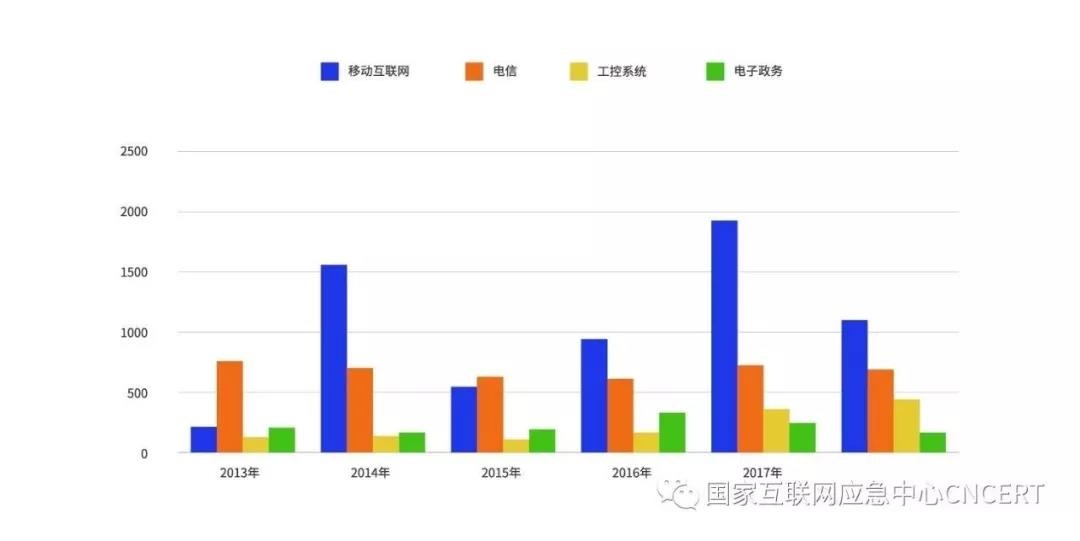 2018年,CNVD继续推进移动互联网、电信行业、工业控制系统和电子政务4类子漏洞库的建设工作,分别新增收录安全漏洞数量1,150个(占全年收录数量的8.1%)、720个(占5.1%)、461个(占3.2%)和171个(占1.2%),如图10所示。其中工业控制系统子漏洞库收录数量持续攀升,较2017年增长了22.6%。CNVD全年通报涉及政府机构、重要信息系统等关键信息基础设施安全漏洞事件约2.1万起,同比下降23.6%。