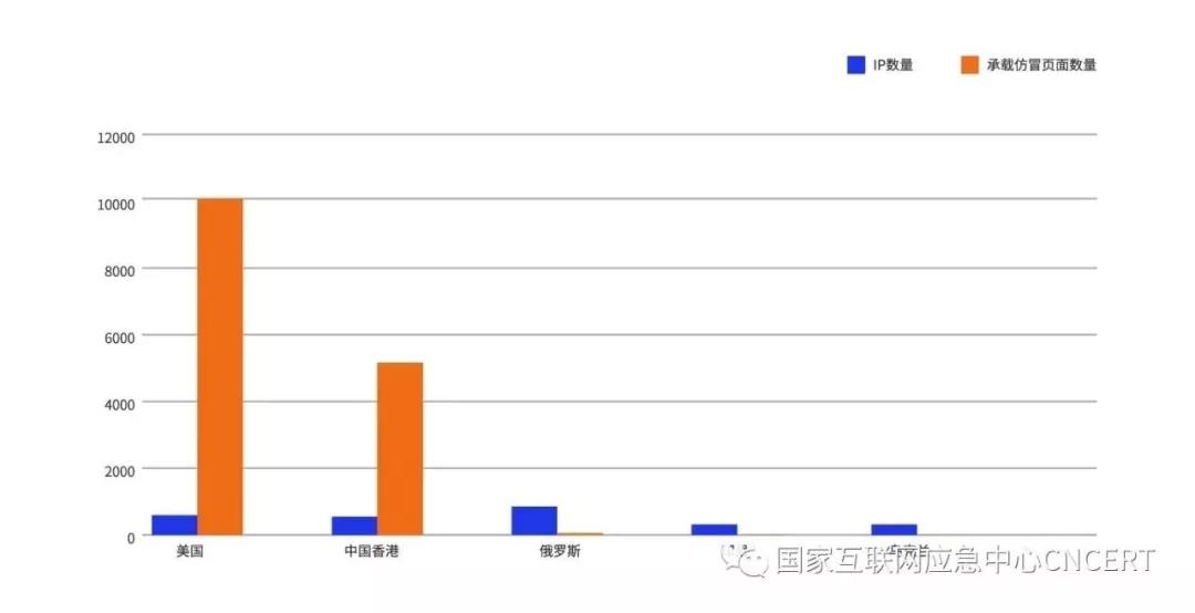 2018年,CNCERT自主监测发现约5.3万个针对我国境内网站的仿冒页面,页面数量较2017年增长了7.2%。其中,仿冒政务类网站数量明显上升,占比高达25.2%,经分析,这些仿冒页面主要被用于短期内提高其域名的搜索引擎排名,从而快速转化为经济利益。为有效防范网页仿冒引发的危害,CNCERT重点针对金融行业、电信行业网上营业厅的仿冒页面进行处置,全年共协调处置仿冒页面3.5万余个。从承载仿冒页面IP地址归属情况来看,绝大多数位于境外,主要分布在美国和中国香港,如图11所示。