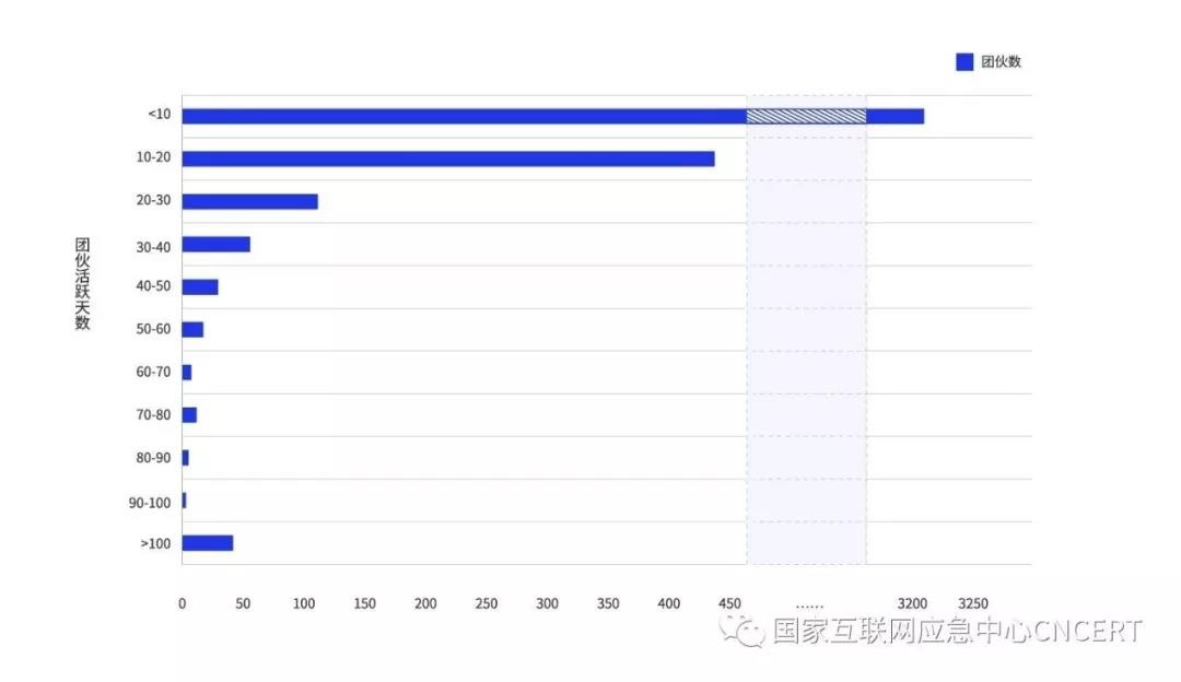 2018年,CNCERT监测发现,攻击活跃在 10 天以上的网站“攻击团伙”有 777 个,全年活跃的“攻击团伙”13 个,如图所示。“攻击团伙”中使用过的攻击 IP地址数量大于 100个 的有 22 个,攻击网站数量超过 100 个的“攻击团伙”有 61 个。从“攻击团伙”的攻击活跃天数来看,少数攻击团伙能够保持持续活跃,如图13所示。多数“攻击团伙”的活跃天数较短,无法形成对被入侵网站服务器的持久化控制;少量值得关注的“攻击团伙”具有长时间持续攻击的特点,持续对其入侵的多个网站服务器实现长期控制。