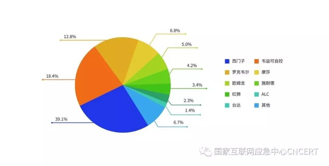 2018年,CNCERT不断升级监测手段,扩大监测范围,进一步加强了针对联网工业设备和工业云平台的网络安全问题跟踪,全年累计发现境外对我国暴露工业资产的恶意嗅探事件约4,451万起,较2017年数量暴增约17倍;发现我国境内暴露的联网工业设备数量共计6,020个,涉及西门子、韦益可自控、罗克韦尔等37家国内外知名厂商产品,如图16所示,这些联网设备的厂商、型号、版本、参数等信息遭恶意嗅探。另外,CNCERT发现具有一定规模的工业云平台30多家,业务涉及能源、金融、物流、智能制造、智慧城市等方面,并监测发现根云、航天云网、COSMOPlat、OneNET、OceanConnect等大型工业云平台持续遭受漏洞利用、拒绝服务、暴力破解等网络攻击,工业云平台正逐渐成为网络攻击的重点目标。
