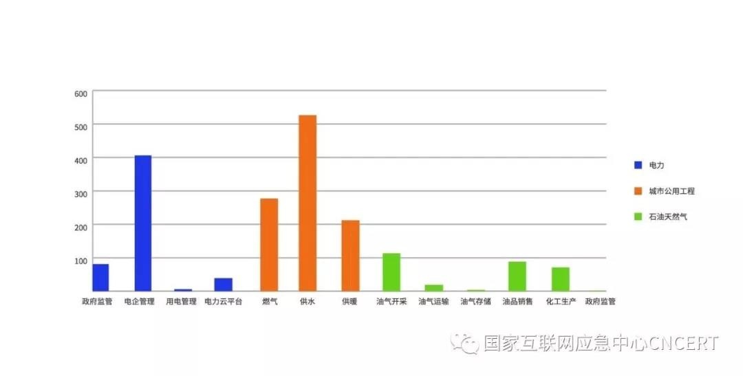 电力、石化等重点行业的生产监控管理系统因存在网络配置疏漏等问题,可能会直接暴露在互联网上,一旦遭受网络攻击,影响巨大。为评估重要行业联网工业监控管理系统的网络安全风险情况,2018年CNCERT对电力、城市公用工程、石油天然气三个行业开展了远程安全巡检工作,发现电力行业暴露相关监控管理系统532个,涉及政府监管、电企管理、用电管理和云平台4大类;城市公用工程行业暴露相关监控管理系统1,015个,涉及供水、供暖和燃气3大类;石油天然气行业暴露相关监控管理系统298个,涉及油气开采、油气运输、油气存储、油品销售、化工生产和政府监管6大类,如图17所示。同时,CNCERT分析发现,电力、城市公用工程和石油天然气三个行业的联网监控管理系统均存在高危漏洞隐患,各自占监控管理系统的比例为10%、28%和35%,且部分暴露的监控管理系统存在遭境外恶意嗅探、网络攻击的情况。