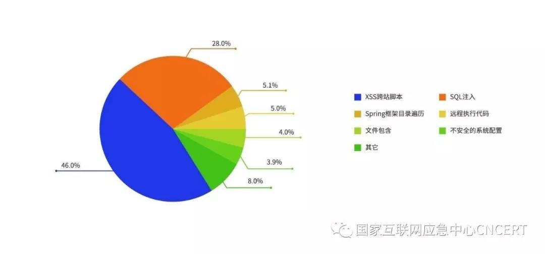 2018年,CNCERT发现互联网金融网站的高危漏洞1,700个,其中XSS跨站脚本类型漏洞占比最多有782个(占比46.0%);其次是SQL注入漏洞476个(占比28.0%)和远程代码执行漏洞85个(占比5.0%),如图18所示。近年来,随着互联网金融行业的发展,互联网金融平台运营者的网络安全意识有所提升,互联网金融平台的网络安全防护能力有所加强,特别是规模较大的平台,但仍有部分平台安全防护能力不足,安全隐患较多,CNCERT监测发现高危互联网金融网站330个,其中部分平台存在的高危漏洞数量超过10项。