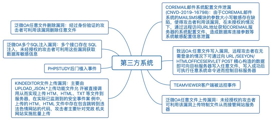 伴随互联网金融的发展,不同类型的金融机构为满足用户的个性化需求,在建立系统开发能力的过程中,大量使用第三方的应用或框架,比如OA系统、邮件系统等,以便提升金融服务效能,这也导致第三方系统漏洞成为较为常见的攻击选择。