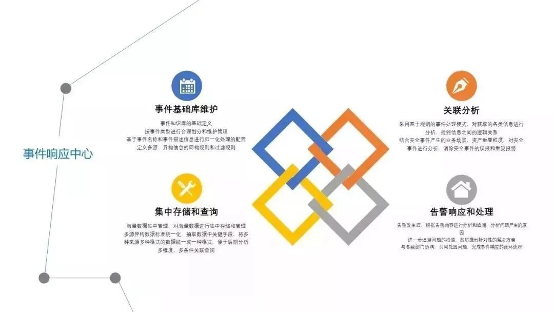 基于规则配置和自动关联,实现对监控采集、同构、归并的信息进行智能关联判别,并综合展现信息系统中发生的预警和告警事件,帮助安全管理人员快速定位、排查问题所在。