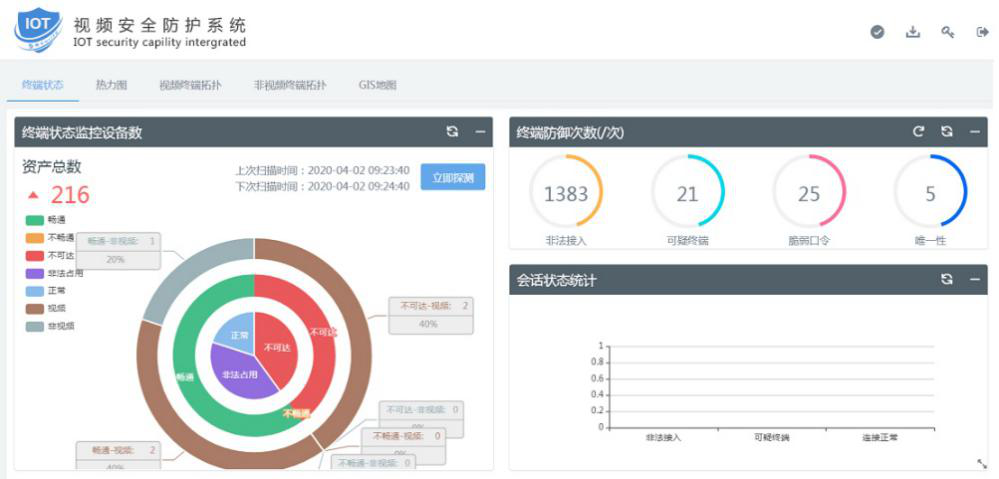 该产品部署于视频监控网络的子网边界,融合资产及链路状态监控、终端准入及安全防护等功能,可主动检查视频监控网络各级节点的链路状态,同时对视频监控网络的接入及入侵攻击进行实时防护,主动而有效的保护视频监控网络安全。