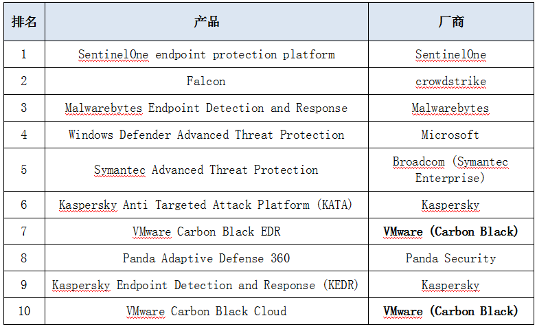 Gartner2019年顾客的选择,EDR上榜的10位厂商和产品分别是: