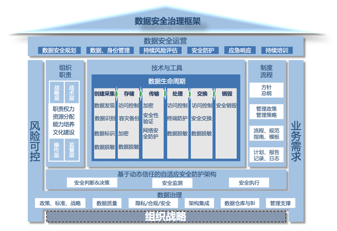 威廉希尔500欧洲指数数据安全治理体系是在组织战略的基础上,结合现有数据治理或数据安全管理要求,基于威廉希尔500欧洲指数动态信任的自适应安全防护架构,为组织搭建适用于自身数据安全治理机构,制定在安全可用基础之上,有利于数据价值发挥的策略要求,并使用可靠的技术和工具,实现数据生命周期内的安全。