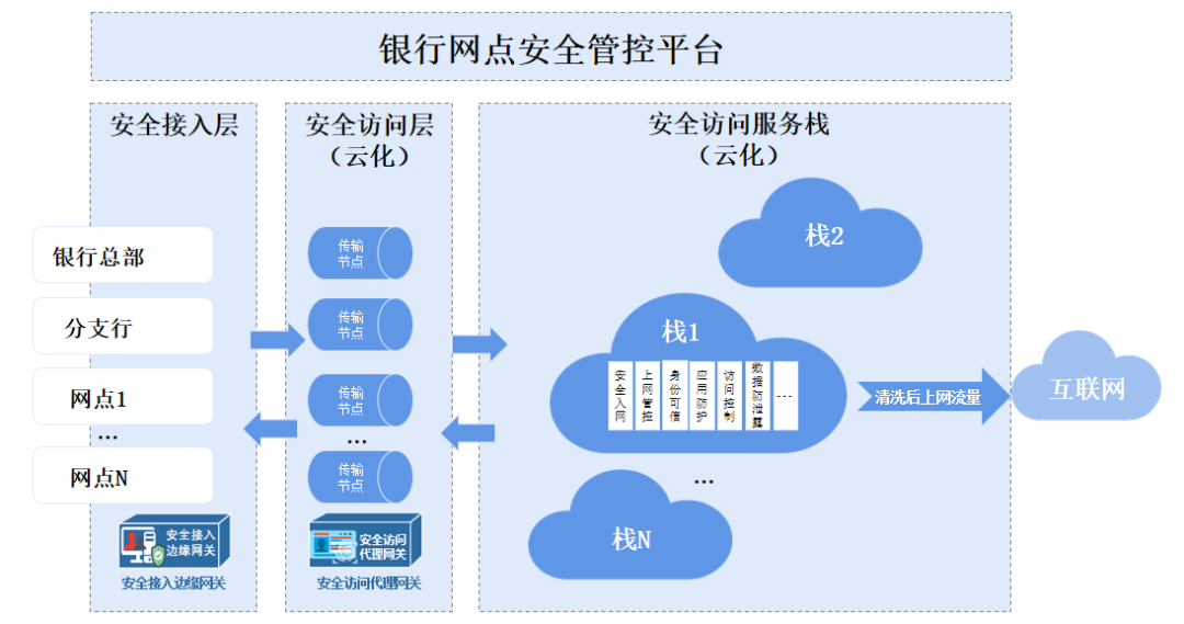 1、安全接入层:负责对银行总部、分支行、网点接入办公互联网的对象进行设备发现、身份认证、安全检查、接入管控;