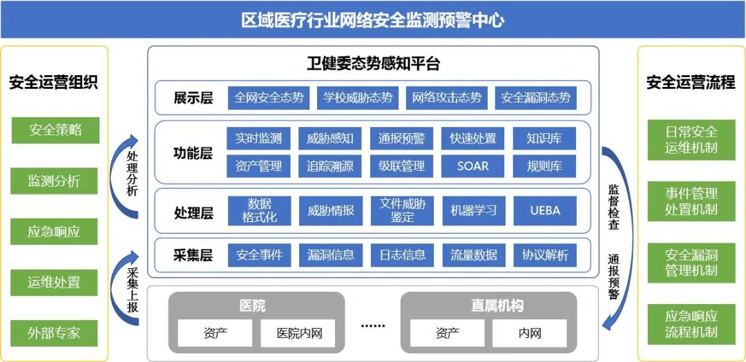 面向健康医疗行业的信息化场景,威廉希尔500欧洲指数关键信息基础设施智能化安全运营服务体系结合网络安全“三同步”原则,以安全风险和安全合规为驱动的服务理念,聚合“人员、流程、技术”进程,通过智能安全运营中心为各单位(各机构、各部门)输出专项基础安全服务、实战演练安全服务、持续性威胁管理与风险管控服务、应急响应及协同指挥服务和重大活动保障安全服务,有效支撑行业内各部门关键信息基础设施识别、防护、检测、分析、监测预警、追踪溯源、事件处置、安全恢复安全能力的建设,保护关键信息基础设施安全,面向场景需求,落实“三化六防“,立足三位一体共筑关基防控体系。