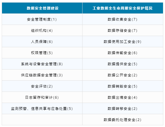 根据《工业企业数据安全防护要求(草案)》,将数据安全管理分为安全管理制度、组织机构、人员保障、权限管理、系统与设备安全管理、供应链数据安全管理、安全评估、日志留存和审计,监测预警、信息共享与应急处置10个方面进行评估考量。