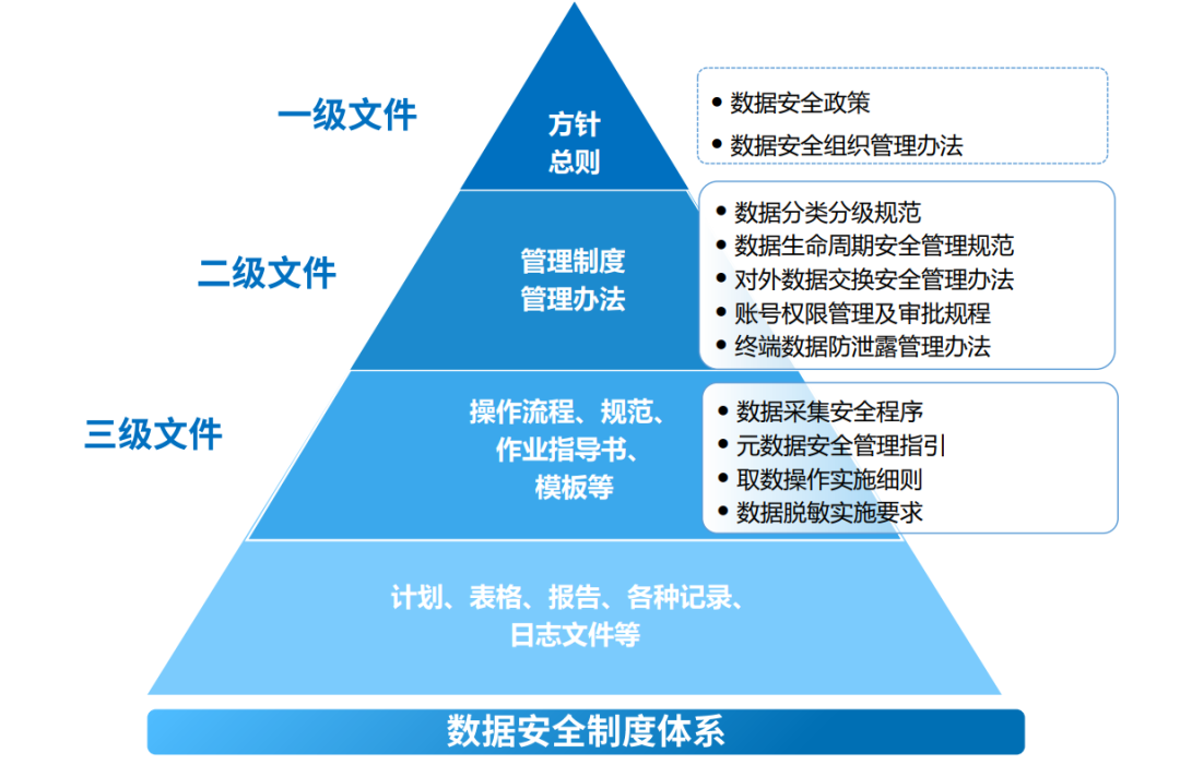制度规范建设:在进行数据安全管理制度和规范的设计时,范围应覆盖数据的全生命周期,以4级文件形式进行建设,建设前期应对现有制度规范进行差距分析,按照差距分析结果进行建设,建设完成后应对制度规范进行落地场景测试,确保其建设内容有效且可执行。